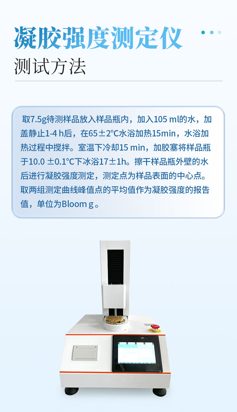 凝膠強度測儀適用于凝膠、果膠、硅膠、結冷膠、卡拉膠、瓊脂、阿拉伯膠、黃原膠、魔芋膠和瓜爾膠等的破裂強度、彈性、延展性、拉伸強度、粘附度、回復性等測試。凝膠強度測儀也叫凍力強度儀 ,明膠凝凍強度測定儀,組織分析儀或凍力測試儀。