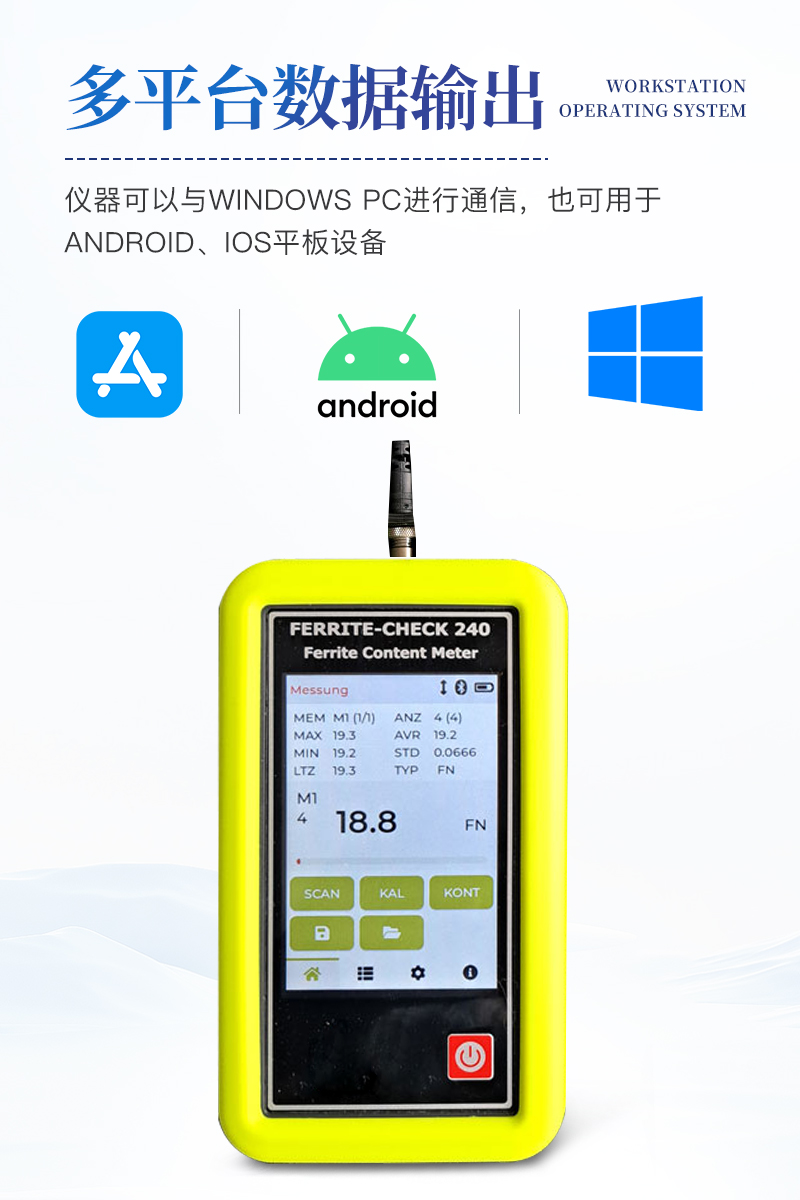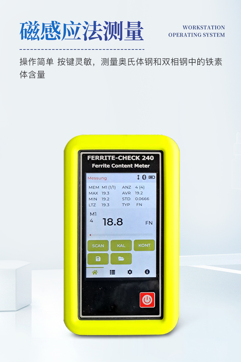 鐵素體含量檢測儀采用分體式的設計,使用方便,儀器符合Basel標準DIN EN ISO 8249,使用磁感應法測量奧氏體鋼和雙相鋼中的鐵素體含量。