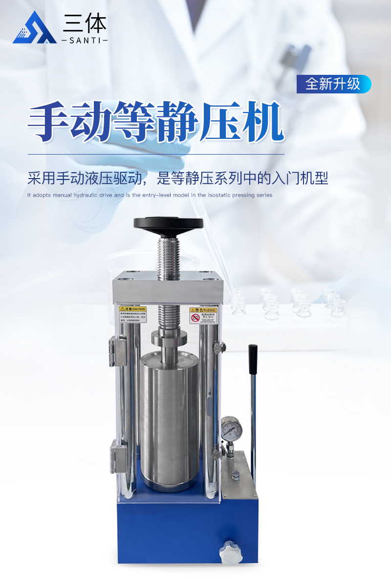手動等靜壓機該機采用手動液壓驅動,是等靜壓系列中的入門機型,因其經濟性,每次制樣取樣均需要搬動等靜壓腔體,適合制樣少,對工作效率要求不高,有力氣且安全意識較高的男士操作使用。