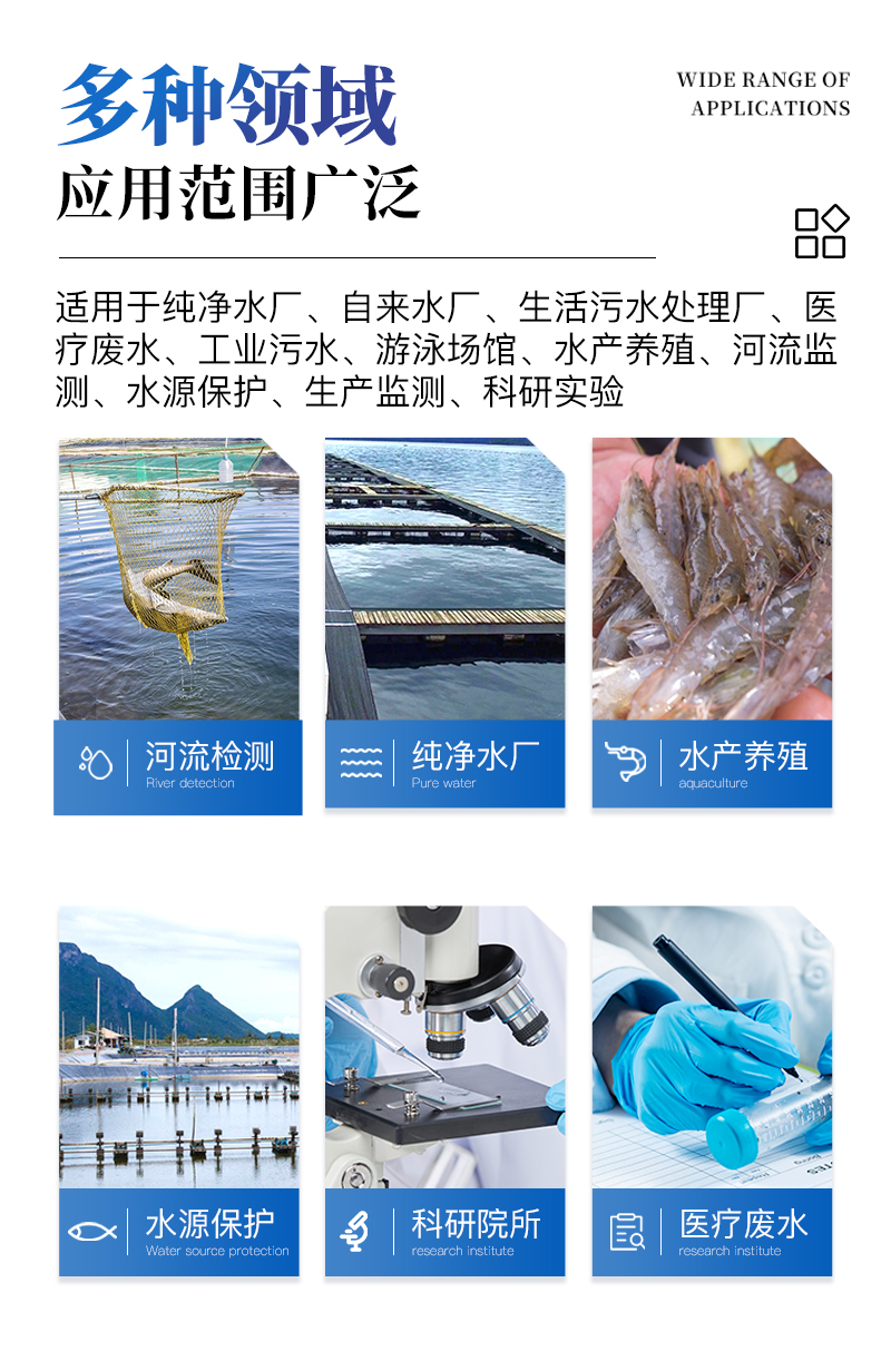 適用于純凈水廠、自來水廠、生活污水處理廠、**廢水、工業(yè)污水、游泳場館、水產(chǎn)養(yǎng)殖、河流監(jiān)測、水源保護(hù)、生產(chǎn)監(jiān)測、科研實(shí)驗(yàn)等。
